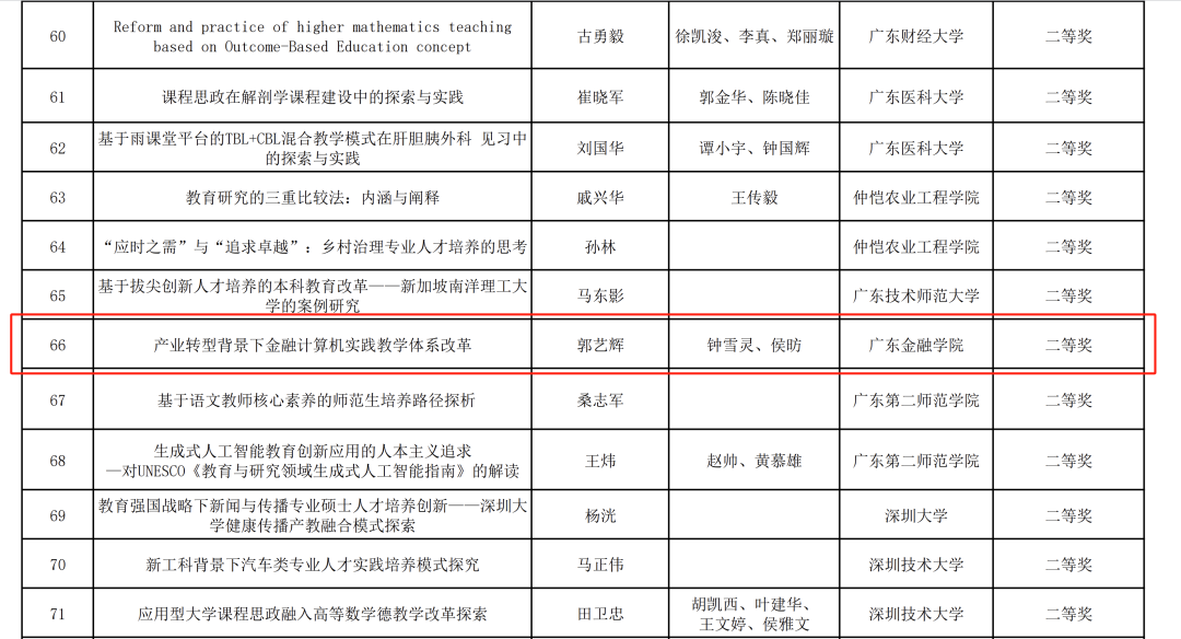 近日,广东省高等教育学会公布了第三届高等教育研究优秀成果奖获奖名单。此次评奖一等奖不超过参评成果的10%,二等奖不超过15%,三等奖不超过25%。Ky官网郭艺辉、钟雪灵、侯昉三位老师合作的论文《产业转型背景下金融计算机实践教学体系改革》获评第三届高等教育研究优秀成果奖二等奖一项。