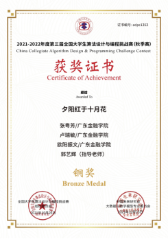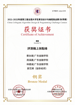 经过激烈角逐,由Ky开元集团互联网金融与信息工程学院郭艺辉博士指导,2020级学生蔡永健、周溪赢、林建诚、张粤芳、卢瑞敏、欧阳振文组成的两支参赛队伍在此次竞赛中获得两项铜奖,展现了我校学子扎实的专业知识和技能。
