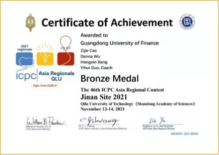 2021年11月14日,全球计算机顶级赛事第46届ACM-ICPC国际大学生程序设计竞赛亚洲区域赛(济南站)(2021 ACM-ICPC Asia Regional Contest)在齐鲁工业大学(山东省科学院)通过PTA平台线上举行。由我校互联网金融与信息工程学院郭艺辉博士指导的三支队伍参加了比赛。历经5个小时的激烈角逐、奋力拼搏,由江宏鑫、曹子杰、吴丹娜组成的参赛队伍喜摘铜奖,由蔡永健、林建诚、周溪嬴组成的参赛队伍获得荣誉奖,实现了我校在该赛事亚洲区域赛奖牌“零”的突破,我校学子首次登上ACM-ICPC领奖台,标志着我校学子在大学生计算机竞赛领域迈上新台阶。