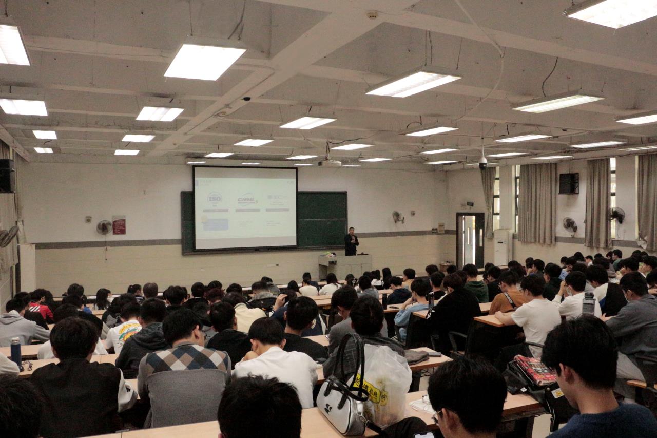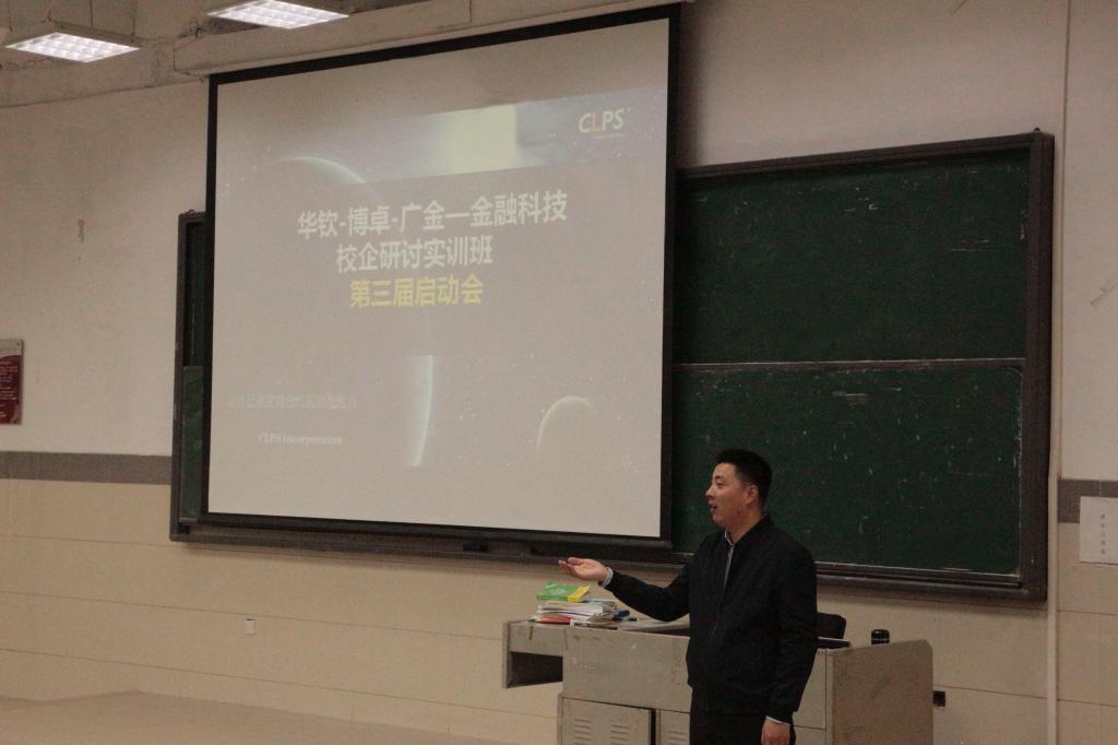会上,魏江涛老师分别从公司历程、人才概况、主要客户和资历荣誉等方面,全面介绍了华钦科技公司概况,并分享了当前金融科技行业前景和人才现状及需求。他指出,大学生应当努力掌握技术能力、业务知识、项目开发规范和流程以及团队协作沟通能力等,为成为有专业化水平和创新性思维的复合型人才做准备。