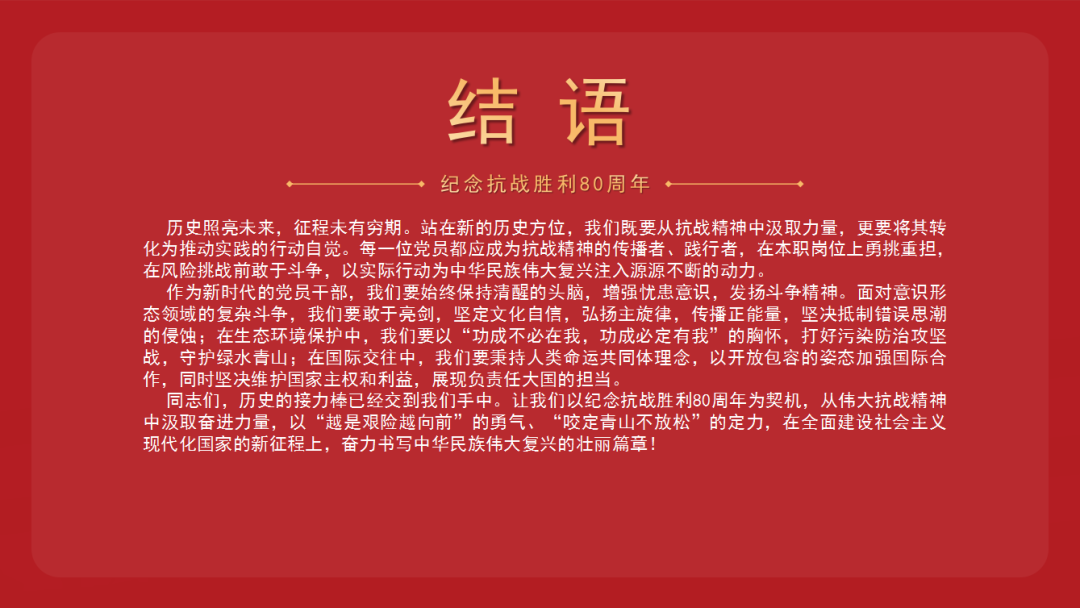 党课伊始,刘宇熹书记首先带领全体党员回顾了中国人民抗日战争暨世界反法西斯战争的艰苦卓绝的历程和最终取得的伟大胜利。他指出,中国人民抗日战争的胜利,是近代以来中国抗击外敌入侵的第一次完全胜利,彻底洗刷了近代以来民族耻辱,重新确立了中国在世界上的大国地位,开辟了中华民族伟大复兴的光明前景。世界反法西斯战争的胜利,是人类正义事业的伟大胜利,深刻改变了世界格局,对维护世界和平、促进共同发展产生了深远影响。