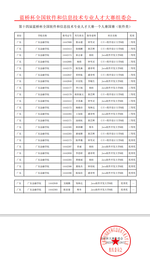 经过激烈角逐,蔡永健、徐展鹏、杨煌、曾梓航4位同学获C/C++程序设计大学B组全国二等奖,崔志豪、陈发森、许佳悦3位同学获Java软件开发大学B组全国二等奖,欧阳振文、杨晓诗、汤雨杭、廖斌楷4位同学获C/C++程序设计大学B组全国三等奖,李汀扬、卓景森、王加炫、林妙姗4位同学获Java软件开发大学B组全国三等奖,陈萃薇同学获C/C++程序设计大学B组全国优秀奖,曾诚、李思婷、黄晓斌、萧海杰、陈灿佳、吴晓腾、陈家豪7位同学获Java软件开发大学B组全国优秀奖。