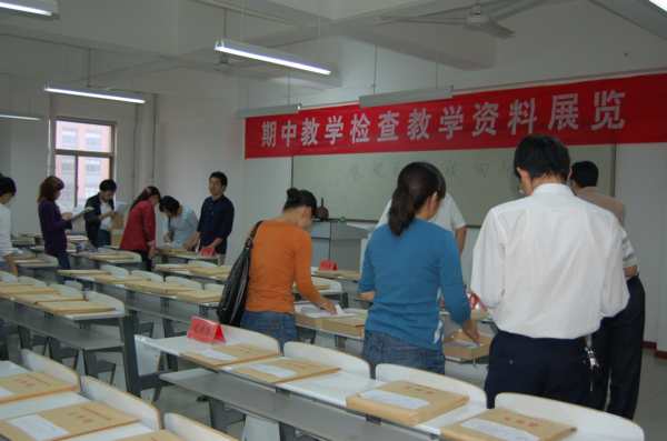 教师的各种教学资料是否规范不仅是我院迎接教育部关于独立学院评估的重要教学环节,而且从侧面可以了解一个教师的治学精神和态度。5月8日至9日,在教学一号楼201教室,教务处组织了本学期期中教学检查教学资料展览。展览过程中,张院长、徐副院长、赵副院长亲临展览现场,仔细翻阅了部分教师的教学资料,对其中一些优秀的教学资料提出了赞扬,也对个别系部个别教师教学资料所存在的问题提出了改进意见。