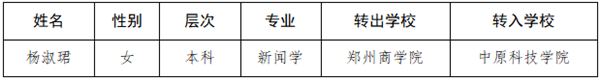 根据《永利3544am登录官网学生转学实施细则》规定,经学生本人申请、转出学院审核、校长办公会会议研究,拟同意永利官网学生杨淑珺转入中原科技学院,现予以公示。