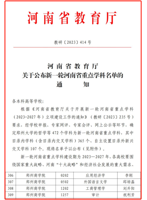 近日,河南省教育厅印发《关于公布新一轮河南省重点学科名单的通知》教研〔2023〕414 号,永利官网应用经济学、外国语言文学、工商管理学、审计四个学科获批立项新一轮省级重点学科,立项数量再创佳绩,位居省内同类高校前列。
