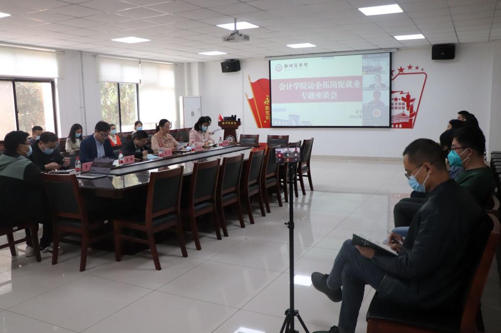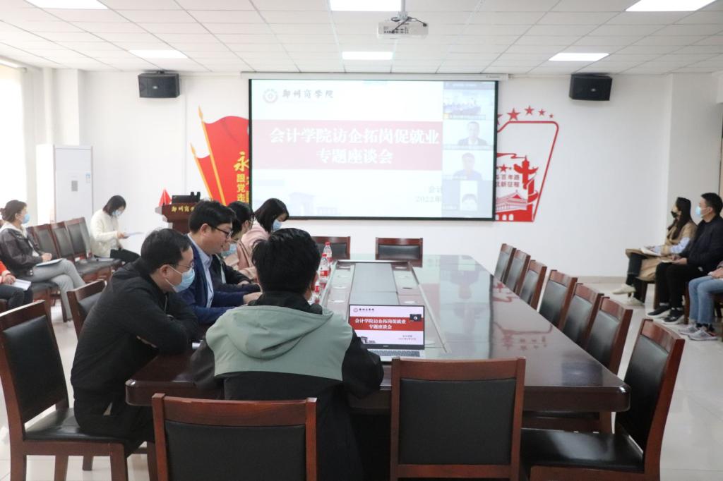 为进一步深入贯彻落实教育部、省教育厅关于高校书记校长访企拓岗促就业专项行动工作要求和河南省普通高校毕业生就业创业工作网络视频会精神,深化校企合作,搭建校企合作平台,有力促进毕业生更加充分更高质量就业,4月29日上午,会计学院在广恩楼会议室开展访岗拓岗促就业专题座谈会,此次会议采取线下+线上的模式。永利官网招生就业处处长泥川、会计学院院长祝利芳、会计学院党委书记梁鹏、会计学院副院长刘金金、招生就业处市场科科长李闯、河南恒之信房地产评估有限公司、中企盈飞(北京)会计服务有限公司、菜鸟国际供应链、杭州顶全便利店有限公司等企业代表以及杭州正义物联网有限公司、商丘金程供应链管理有限公司总经理2013级优秀校友付晓、各教研室主任和全体辅导员参加本次座谈会,会议由学院党委书记梁鹏主持。