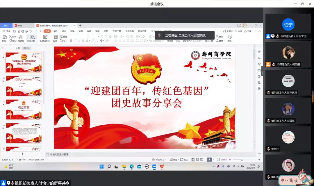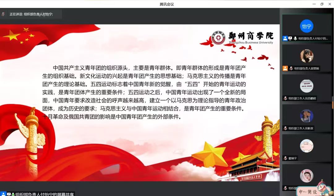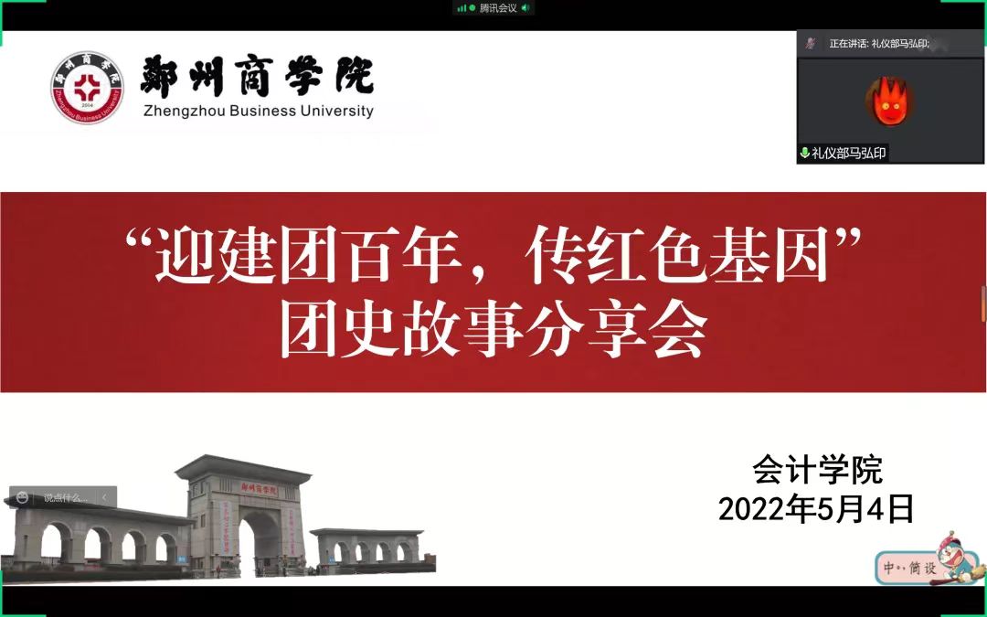 为丰富校园文化生活,弘扬爱国主义精神,展现当代青少年奋发进取、积极向上的精神风貌,庆祝建团百年,5月4日,会计学院于腾讯会议组织开展了“迎建团百年,传红色基因”线上团史故事分享会。