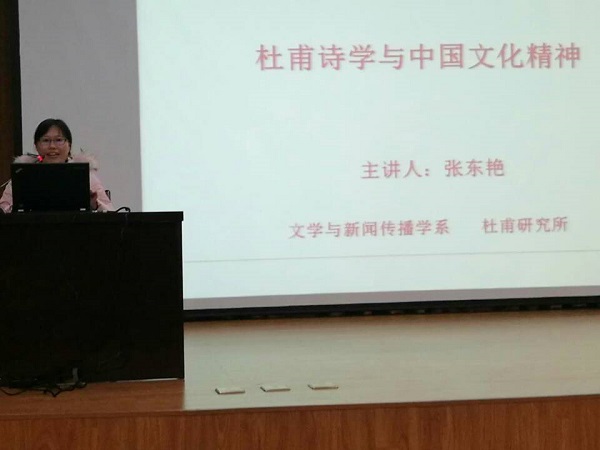 其次,张东艳副教授开启了激情与才情齐飞的学术报告。整场报告围绕“杜甫的千年影响”、“杜甫的伟大的诗”和“杜甫的文化意义”三个板块展开论述。期间,张东艳副教授还特地讲到自己与杜诗的不解之缘,以此鼓励学生阅读杜诗,提升自我。