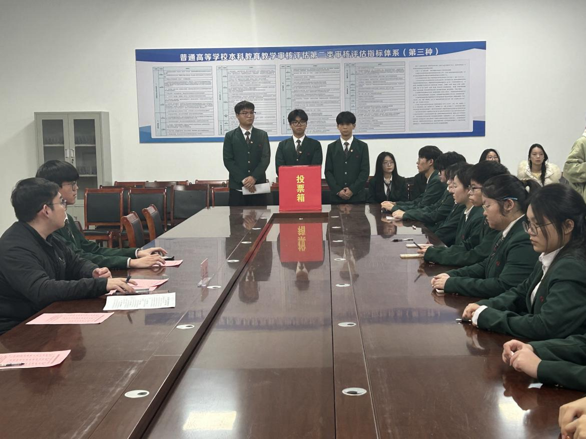 会议伊始,组织部负责人张佳豪为到场的各班级代表分发了选票,确保选举工作的顺利开展。接着,团委副书记郑晓龙对本次选举的会议目的、流程安排以及投票注意事项等内容进行了详尽讲解,旨在确保整个选举过程的公正性、公平性及透明性,让每一位参与者都能明确选举的意义与规则。在了解了选举的各个环节后,各班级代表依次上台进行投票。