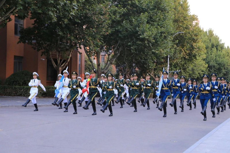 国旗护卫队迈着整齐有力的步伐,护送着鲜艳的五星红旗走向升旗台。国歌奏响之际,全体师生肃立,高唱国歌,行注目礼,国旗在激昂的旋律中冉冉升起。