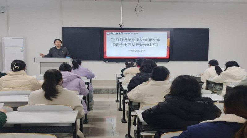 为深入学习习近平总书记关于党的建设的重要思想,2月21日,文传学院学生第三党支部于自力楼206教室开展“学习习近平总书记重要文章《健全全面从严治党体系》专题理论学习交流会”。文传学院学生第三党支部书记杨园园老师、全体党员和入党积极分子共同参加理论学习会,会议由杨园园老师主持。
