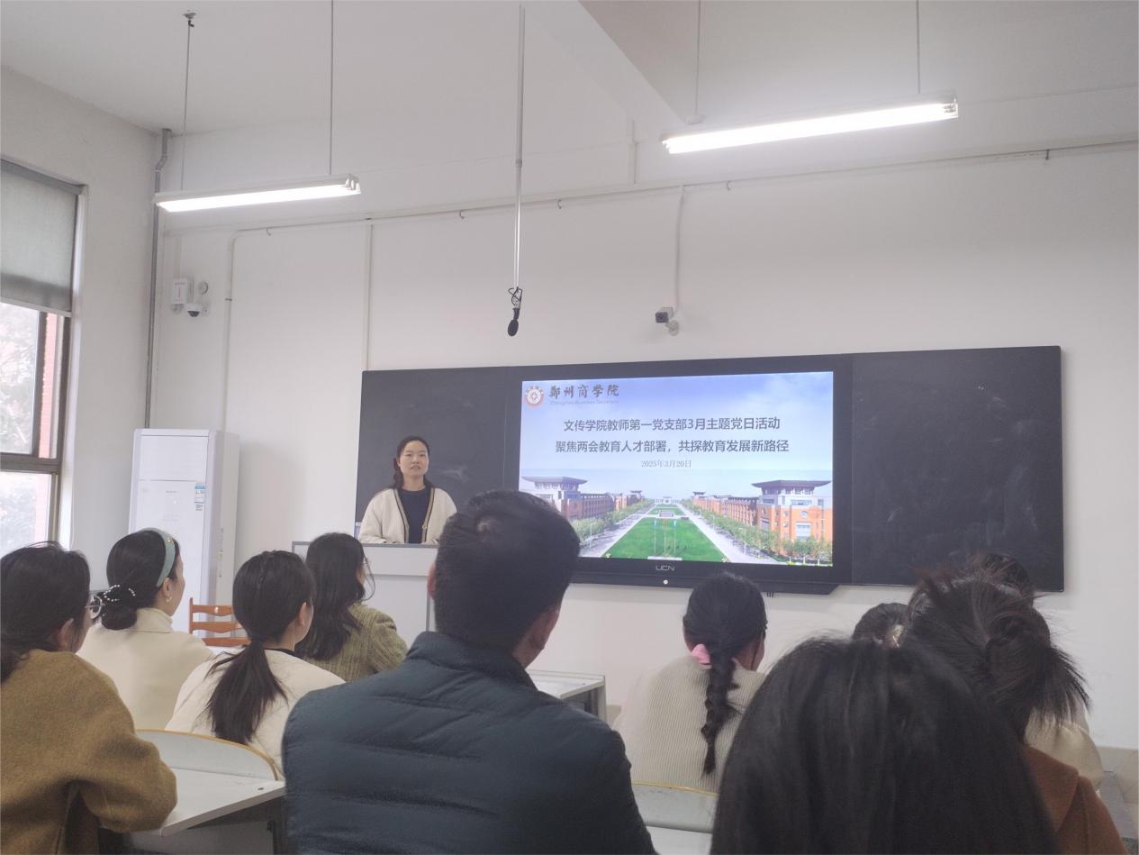 为深入学习贯彻全国两会精神,3月20日,文传学院教师第一党支部于自力楼204教室组织开展“聚焦两会教育人才部署,共探教育发展新路径”主题党日活动。支部全体成员共同参加,会议由组织委员丁箐文主持。