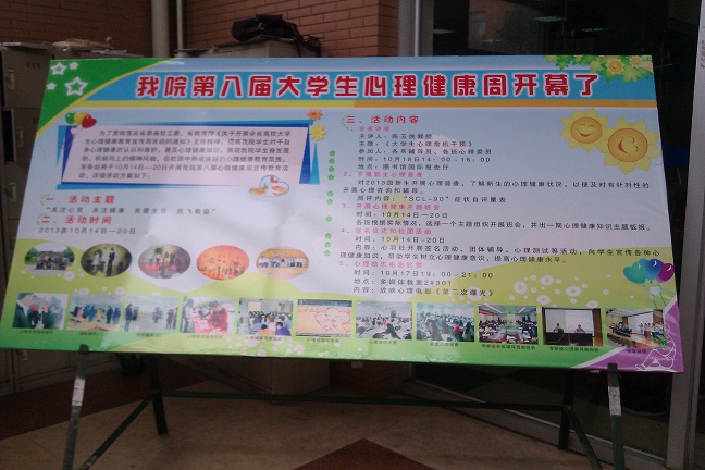 为了贯彻落实省委高校工委、省教育厅《关于开展全省高校大学生心理健康教育宣传周活动的通知》精神,10月14日至20日,我院开展了以“关注心灵,关注健康,关爱生命,放飞希望”为主题的心理健康教育宣传周活动。本次活动目的是为了进一步在全院宣传普及心理健康知识,提高学生关注心理健康的自觉意识,树立正确的心理健康观念,全面推动我院心理健康教育工作发展,营造健康、和谐、阳光的校园育人氛围,提高学生的心理健康水平。活动详细情况如下: