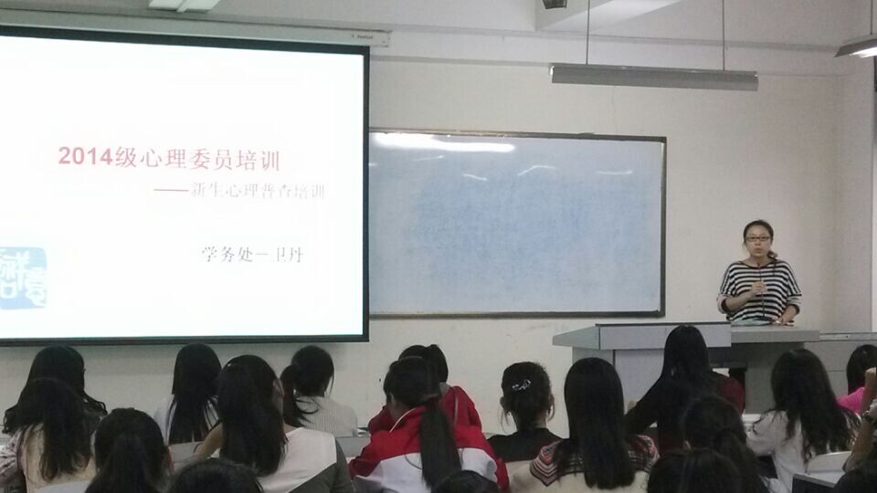10月10日晚18:00,来自全校2014级新生班的102名心理委员齐聚在2号教学楼401教室,参加了由学务处组织的心理委员系列培训第一讲《我院心理健康教育工作概况及新生心理普查流程》的培训,此次培训由学务处心理咨询室卫丹老师主讲。