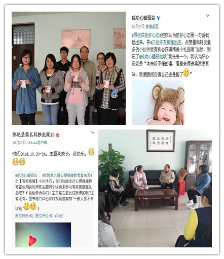 自本学期初我院心理健康教育中心官方微博“成功心晴驿站”开通以来,以其贴近学生心灵的主旨,积极实用的诙谐互动,受到广大师生的关注与好评,在我院第九届大学生心理健康教育宣传周活动期间,官方微博“成功心晴驿站”发起了专题微博互动活动,期间收到大量粉丝的互动与回应,师生广泛参与,积极转发与评论,用新媒体的渠道宣传心理健康知识、传递心理正能量。