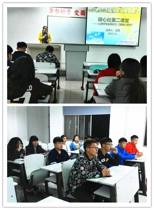 11月3日晚18:00,在1号教学楼206教室驿心社第二课堂第一讲正式开课,社团指导老师学务处心理健康教育中心的卫丹老师担任第一讲主讲人,讲述内容为心理学专业知识之《心理发展与个体成长——发展心理学》。《发展心理学》是心理学专业本科生必学的基础学科之一,主要讲述人从受精卵至生命衰亡整个过程中每个人生阶段的心理发展特点及规律,为学生更好地了解自己、了解父母以及了解孩子提供了专业的心理学视角。卫丹老师围绕发展心理学的研究对象与内容、发展简史、研究方法与基本理论以及胎儿期的心理发展等内容做了详细地讲述,社员们听得津津有味,并从中获得了很多以前从未接触过的心理学专业知识,都表示收获很大,一定会利用好社团的第二课堂,学习更多的心理学知识,从更专业的角度去帮助身边的同学,在社员们热烈的掌声和恋恋不舍的情绪中,驿心社第二课堂第一讲圆满结束。